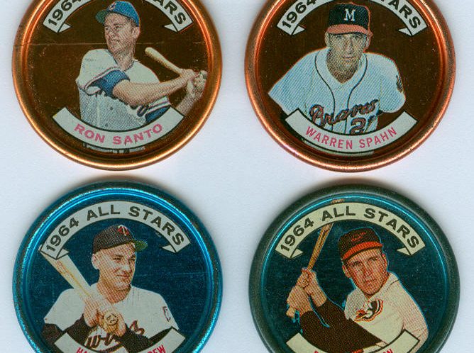 Last week, I ranked the 1971 Coins issue at #12 on my list. The 1964 release ranks higher for a few reasons, beyond the fact that sequels are never as good as the original (except for The Godfather). I noted last week that the 1971 issue, at 153, is large. The 1964 standard checklist has 164 coins — or 120, or 44, depending who you ask. The original checklist was 120 coins large, but an additional 44 All-Star coins were released later in the year. Some collectors consider all 164 as a complete set, but Topps themselves gave reason to consider them separate; the back of the first 120 coins says “COLLECT THE ENTIRE SET OF 120 ALL-STARS”, while the back of the All-Stars says “COLLECT ALL 44 SPECIAL ALL STARS”, lending credence to the idea that they were intended as two separate sets. Therefore, collectors can choose to collect either 164, or 120, or 44, and still claim they are building a set. Those numbers are also open to some interpretation, as there are actually three variations within the set: Mickey Mantle can be found batting either right-handed or left-handed, and Wayne Causey and Chuck Hinton can be found with backs erroneously stating they were in the National League, as well as the corrected American League versions.
